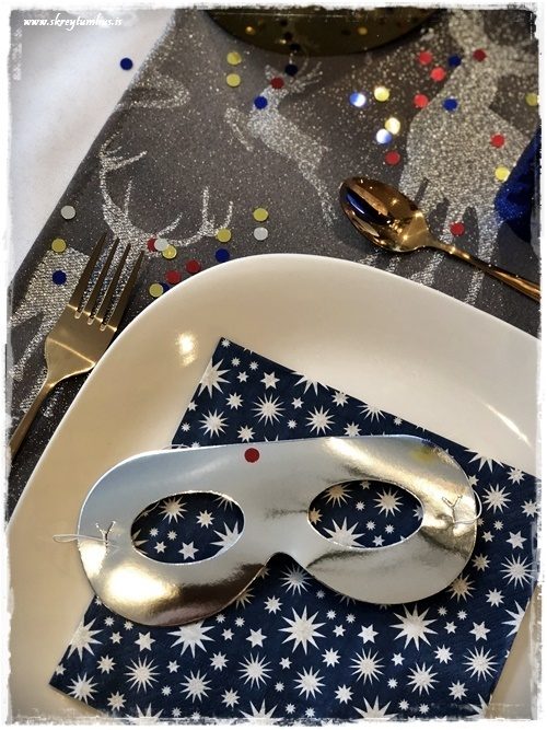 …og síðan grímur, hatta og ýlur.  Ásamt smá konfetti til þess að dreifa í kringum diskana…