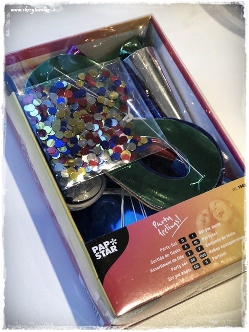 …og síðan grímur, hatta og ýlur. Ásamt smá konfetti til þess að dreifa í kringum diskana…