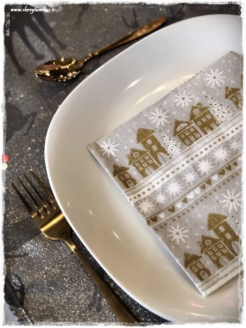 …ég prufaði líka þessar servéttur, sem mér finnst mjög fallegar og blanda saman gulli og silfri…