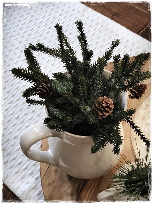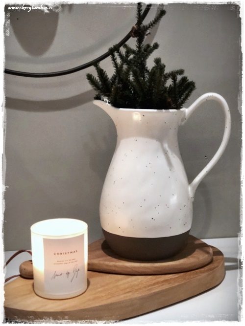 Eins og sést hérna þá held ég eftir bæði glærum seríum og greni. Það er nú þannig að jólatré og greni er ekkert sem er bara til í náttúrunni rétt í desember, og mér þykir bara fallegt að hafa grænt í vösum. Það er því kjörið að árstíðaskipta því, og að hafa grenið á meðan vetur er…