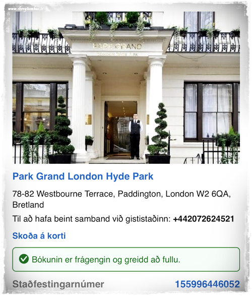 Við bókuðum í gegnum Hotels.com og gistum á Park Grand London Hyde Park (afskaplega þjált hótelnafn). Hótelið er í Paddington og bara 5mín gangur að Hyde Park. Skemmtileg staðsetning og huggó hótel. Við fengum herbergi með tveimur twin rúmum og það fór bara mjög vel um okkur þarna…