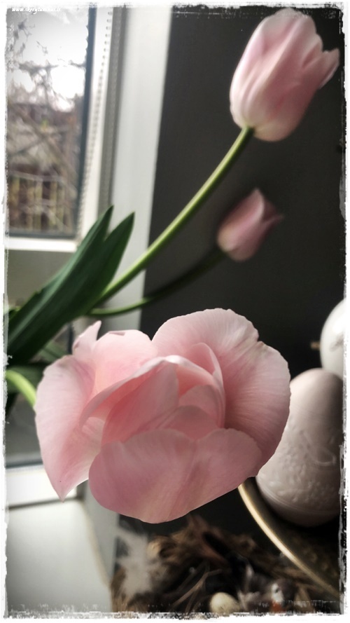 …enn og aftur sannast hið “fornkveðna” – að allt verður betra með blómum. Fölbleikir túlípanar glöddu mig í eldhúsinu…