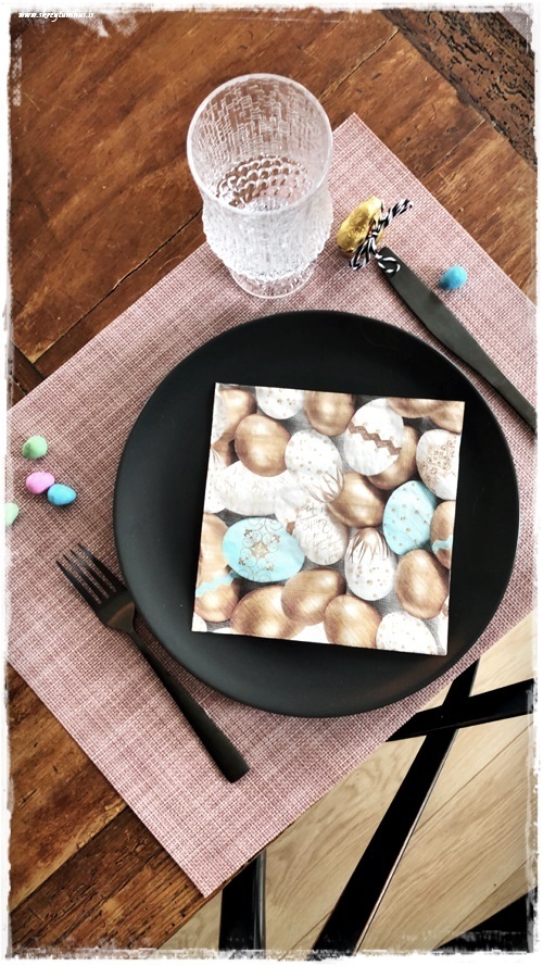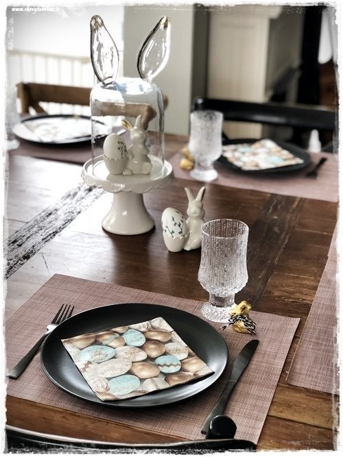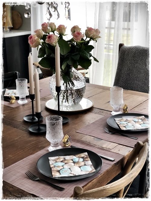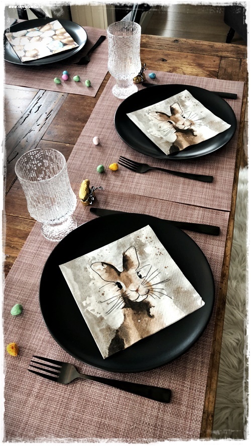 …og við áttum von á foreldrum okkar beggja í páskamatinn og skreyttum borðið því bara frekar einfalt. Fallegar bleikar diskamottur fengust í Rúmfó og lítil M&M páskaegg á þeim…