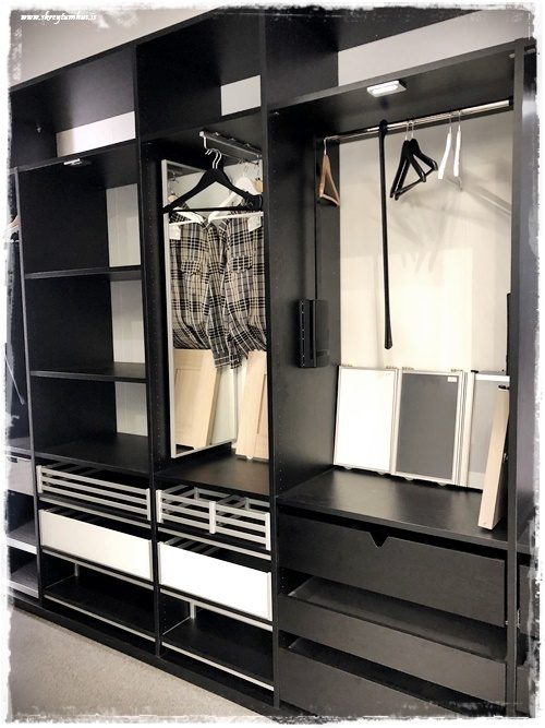 …og eins var mikið af glottum lausnum fyrir skápana, útdraganlegir speglar, slár til þess að toga niður, skóhillur og bara hellingur af sneddí útfærslum…