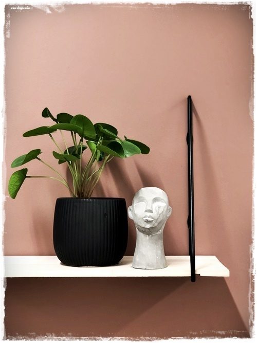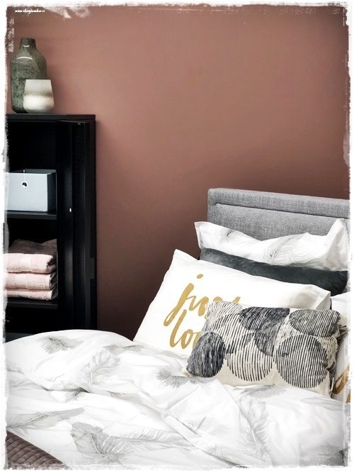 …þar að auki var ég að setja upp svefnpláss núna um daginn og langaði að deila með ykkur myndunum. Það var nýbúið að mála veggina, en starfsmaður Rúmfó fékk þá snilldarhugmynd að taka púða og litgreina hann og snillingarnar í Slippfélaginu blönduðu svo litinn. Í litakortinu mínu var fyrir mjög fallegur fölbleikur litur sem heitir Lekker, og þessi er í sömu fjölskyldu en bara nokkrum tónum dekkri. Það var því ákveðið að bjóða nýja litinn velkominn í SkreytumHús-litakortið mitt, og ég gaf honum hið fallega nafn Haustrós. Lýsir honum bara vel, hann er svona fallega rustic bleikur, ekta inn í haustið…