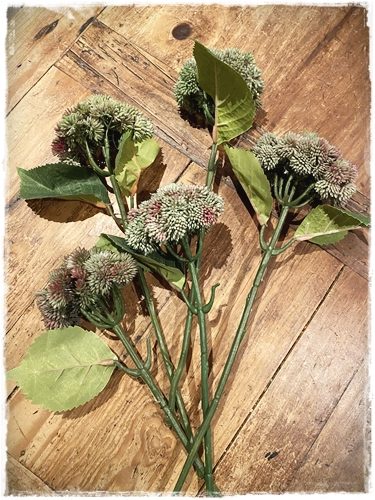 …svo eru það þessi blóm frá Rúmfó. Þetta er Sedum-blóm, og er í raun bara næstum alveg eins og alvöru blómið. Ofsalega fallegt og skemmtileg áferð á því. Síðan eru svona mini Eucaluptus-greinar, og þær eru eins og Baby Blue Eucalytpusinn. Frábært verð á þessum og kostar greinin bara 399kr.