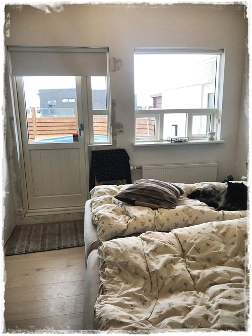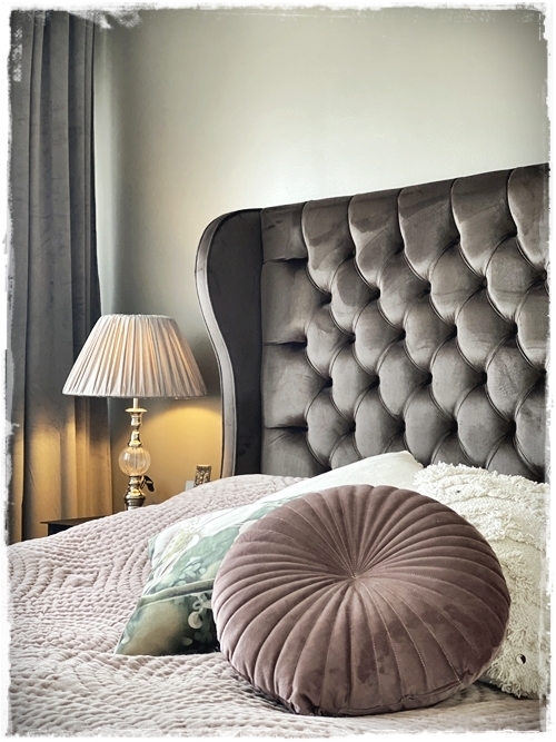 …hjónin voru ákveðin í að fá sér velúr rúmgafl, fengu smá innblástur frá herbergi okkar hjóna (sjá hér) – þannig að þau fengu prufur af efnum hjá RB rúm, og við fórum með þær heim til þess að sjá hvernig þau kæmu út í birtunni inni í herberginu. Þetta er mjög sniðugt þegar maður er að velja, því að birta er mjög mismunandi eftir rýmum/stöðum…