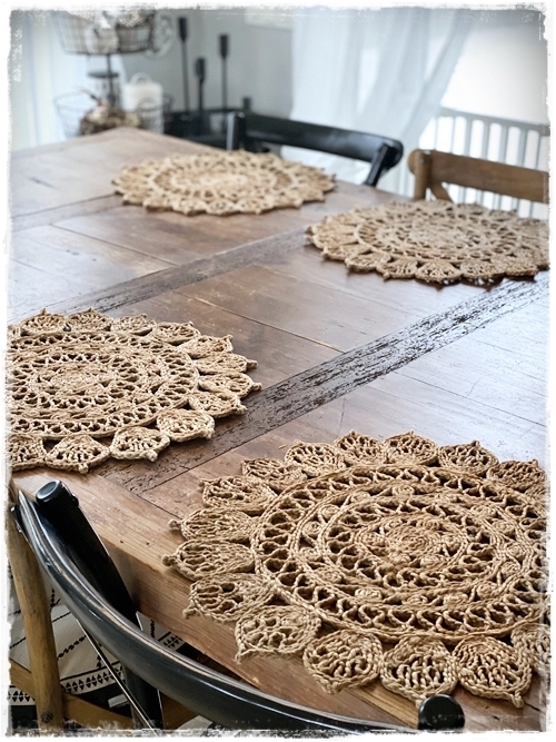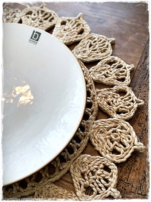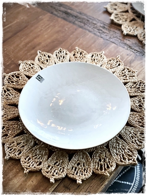 Það sem var mér innblásturinn að þessu sinni voru þessar dásemdar diskamottur – en ég er búin að vera að hugsa um þær síðan ég sýndi þær í þessum pósti hér – smella. Mér finnst þær alveg geggjaðar, eitthvað sem maður getur notað sem diskamottur og svona líka bara sem skraut á borði í raun og veru. Með þeim eru síðan Hessian Broste diskarnir okkar, en þetta stell fengum við í brúðargjöf 2005 en það fæst einmitt í Húsgagnahöllinni í dag…