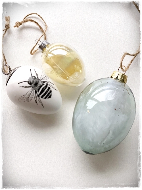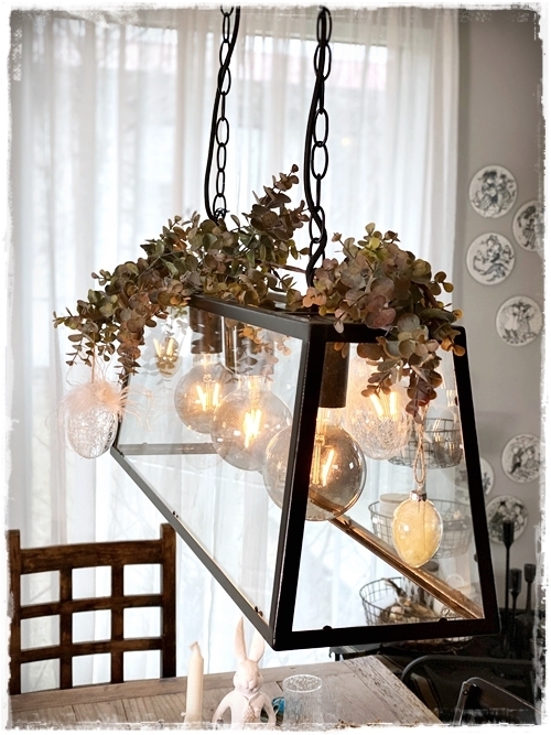 …setti eucalyptusgrein ofan á ljósið okkar, og nokkur falleg egg í hana…