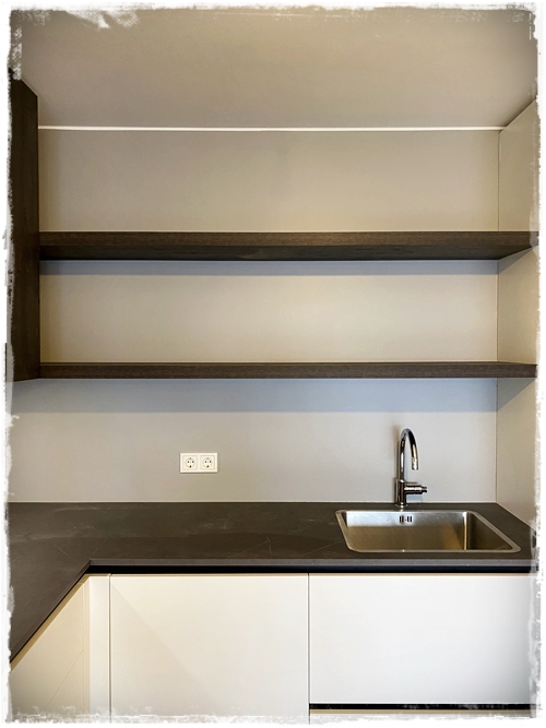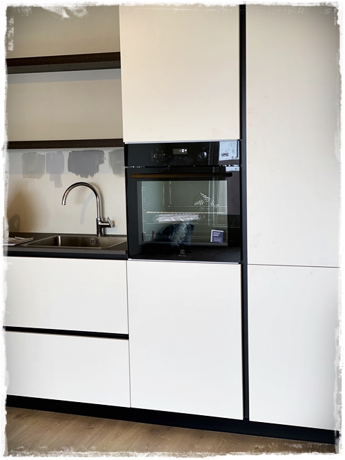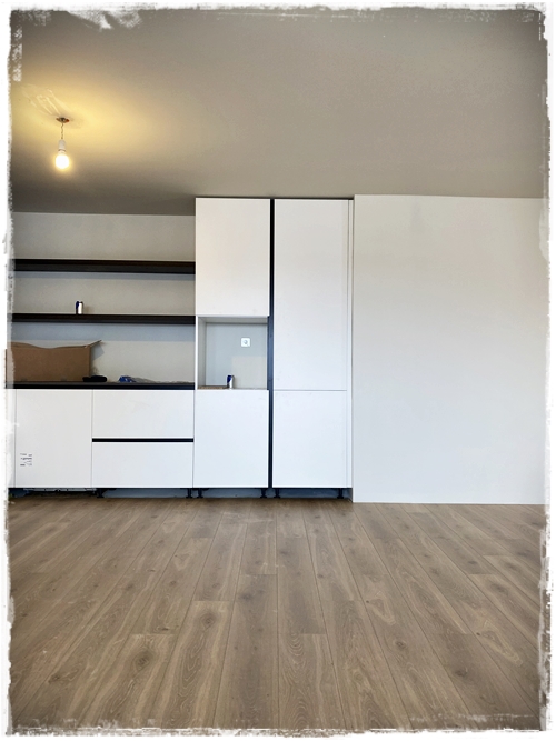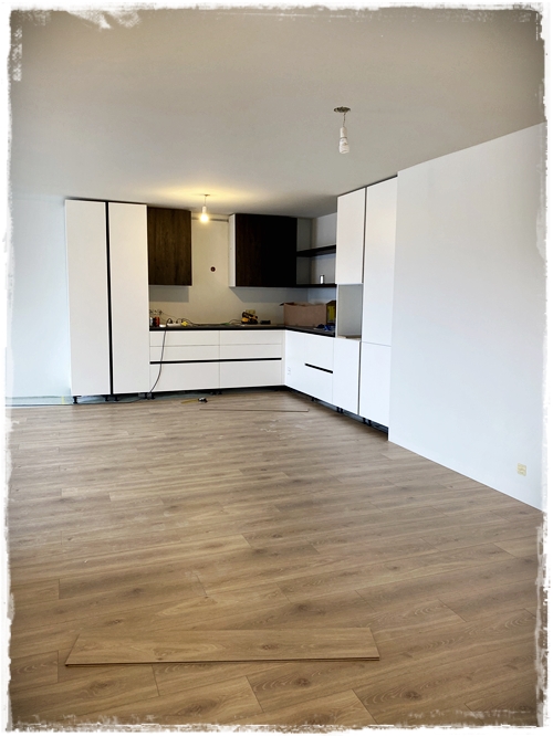 …ég fór þarna inn þegar búið var að setja upp eldhúsinnréttingar, en búið var að velja inn eldhúsið og gólfefnið, og efni í trévegg sem þið sjáið aðeins síðar…