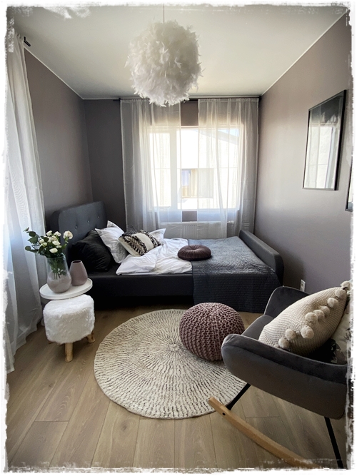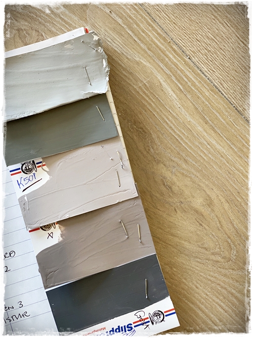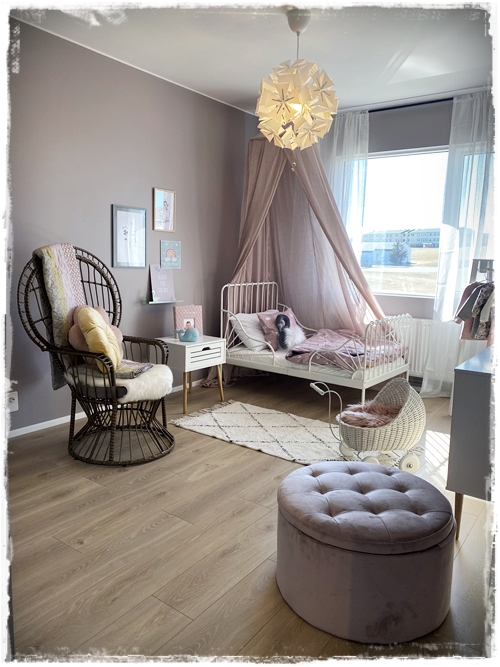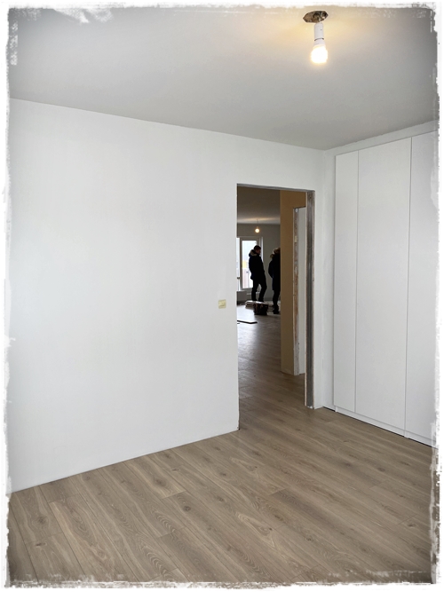 …svo þegar búið var að velja inn liti, þá var það allt hitt sem átti að koma inn, en fyrst – þá fór ég að sjá dásamlega tréskilrúmið sem var sett upp eftir að málað var. Ok, það er geggjað flott og setti alveg tóninn fyrir allt sem var valið inn – þetta þurfti að vera gúrmey!
