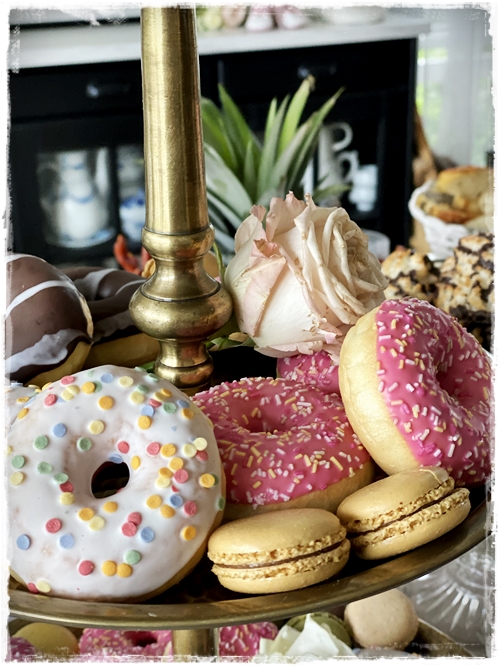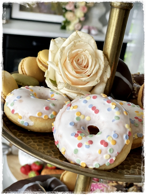 …litskrúðugt og fallegt með makkarónum og kleinuhringjum úr Stórkaup, og einstaka rós stungið með til skreytinga…