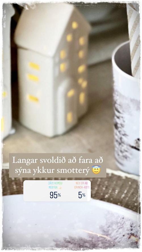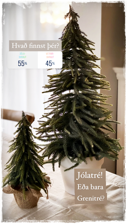 Fyrstar ber að nefna tvær hávísindalegar kannarnir sem ég gerði inni á Instagram, þar sem 45% voru sammála um að grenitré séu vetrarskraut en ekki jólaskraut – ánægð með fólkið. Svo setti ég inn smá svona teaser fyrir vetrarskrautið, og viti menn, 95% vill fara að sjá slíkt, þannig að það er ekki eftir neinu að bíða!