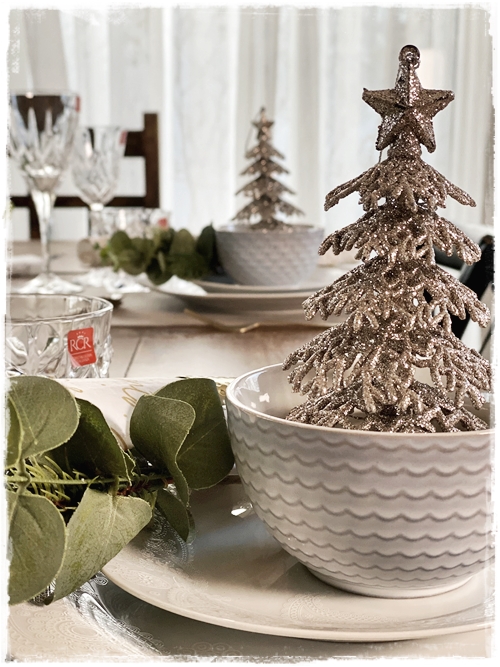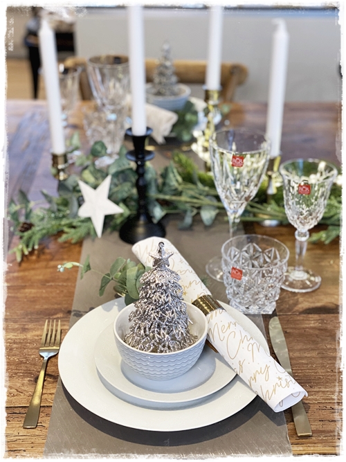 …fannst skemmtilegt að setja servétturnar svona, minntu smá á knallettur á áramótum. Litla gervigreinin með eucalyptus er líka mjög falleg með…