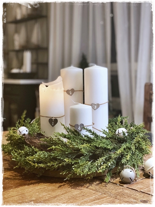…kransinn sjálfur stendur á Broste kökudisk úr Húsgagnahöllinni, sem er því miður uppseldur, og ofan í kransinum er minni kökudiskur til þess að lyfa upp kertunum…