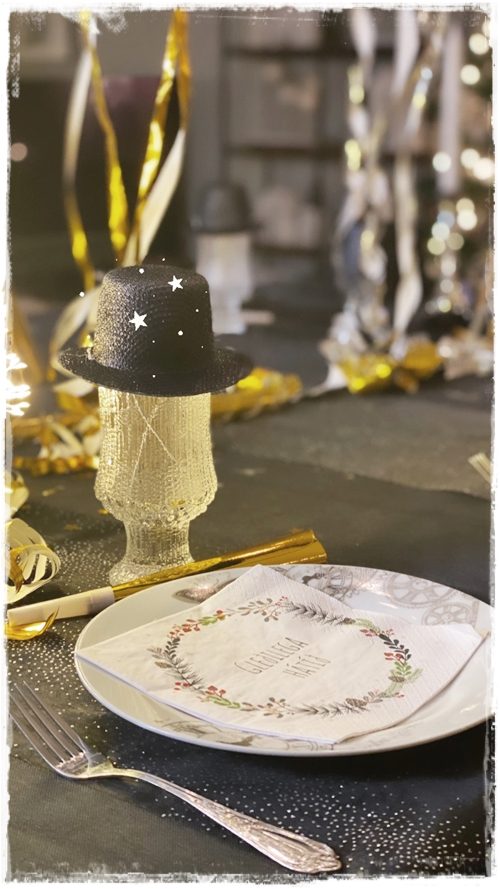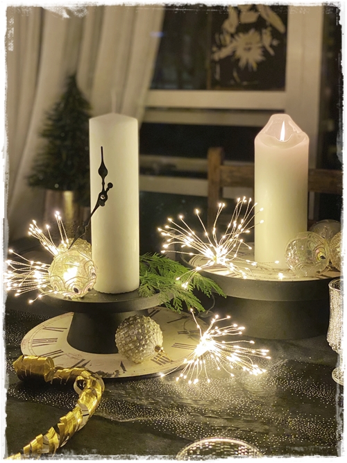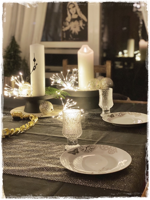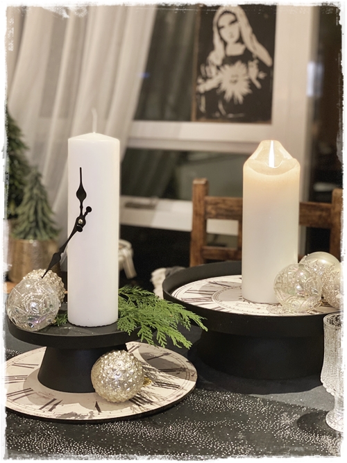 …það kom í ljós þennan dag að við yrðum bara heima hjá okkur á gamlársdag, í fyrsta sinn og ég fór því í geymslu leiðangur til þess að skreyta borðið. Gömul klukka gaf mér smá innblástur…