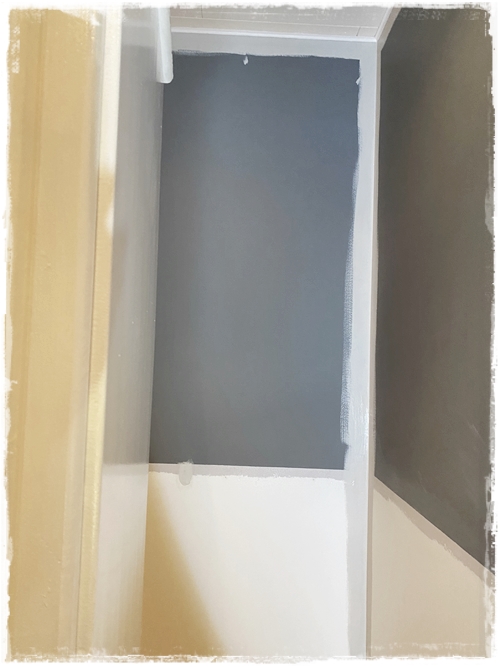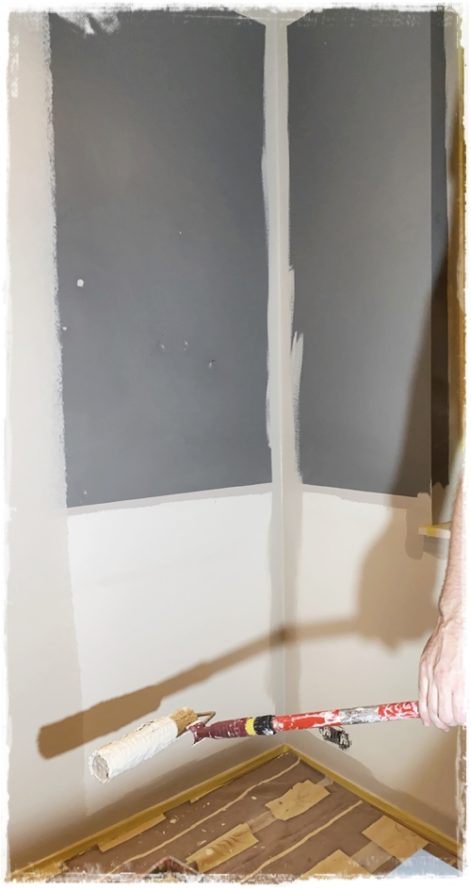 ✿ Byrja að skera með veggjum og gólfi, gluggum og hurðum, það er ýmist hægt að gera þetta með því að teipa fyrst með málningarlímbandi, eða freestyle eins og bóndinn gerir hér, það fer bara eftir hvað hentar ykkur.