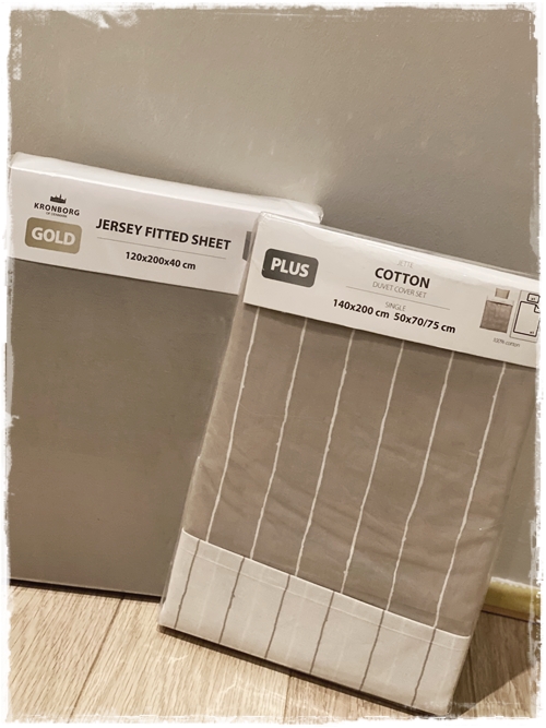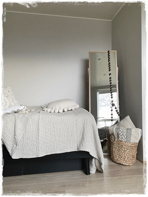 …ég ákvað að nota hjólaborð sem ég átti hérna heima úr Rúmfó* sem náttborð, og setti á það trébakka til þess að gera meira röstic. Síðan fór karfa frá Ikea á neðri hæðina. Við fengum rúmföt og lak sem passaði alveg við vegglitinn í Rúmfó* líka…