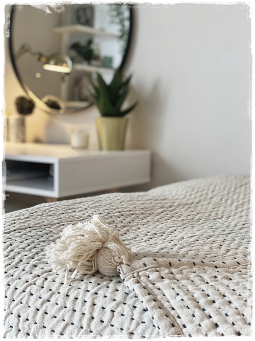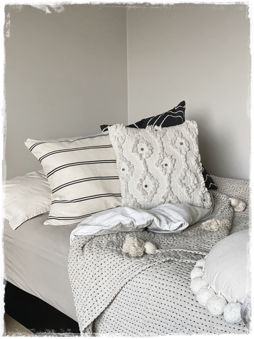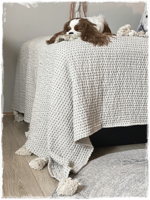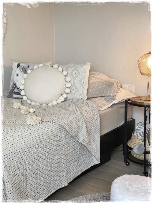 …rúmteppið er í sérstöku uppáhaldi með þessa dásemdardúska, og það var keypt bara fyrir nokkrum vikum. Púðaverin eru síðan eldri, en dúskapúðinn var keyptur á sama tíma og teppið…