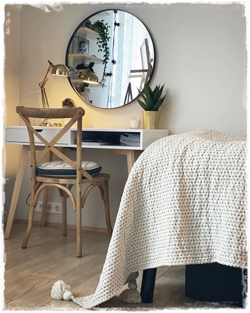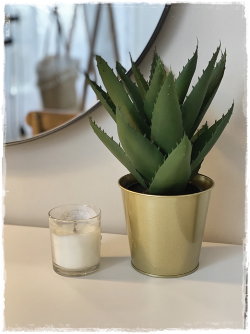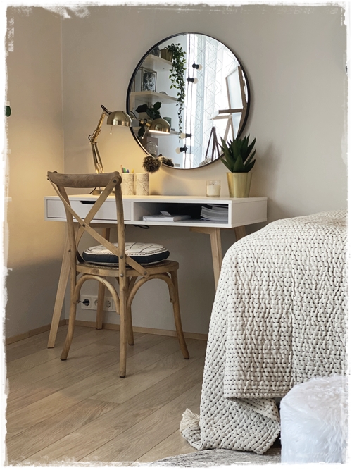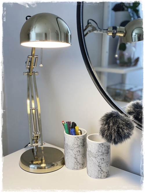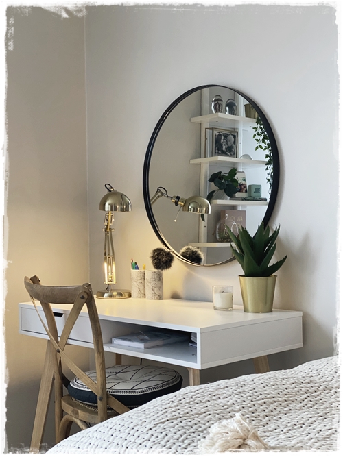 …skrifborðið og spegillinn er bæði frá Rúmfó* og sömuleiðis stóri gerviþykkblöðungurinn, en lampinn og blómapotturinn er frá Ikea…