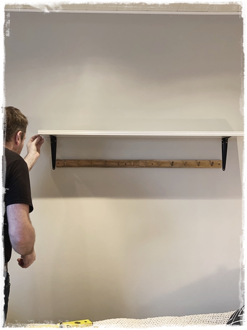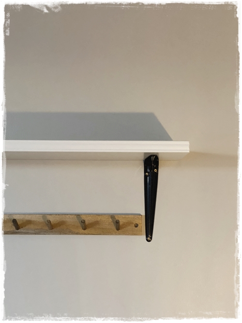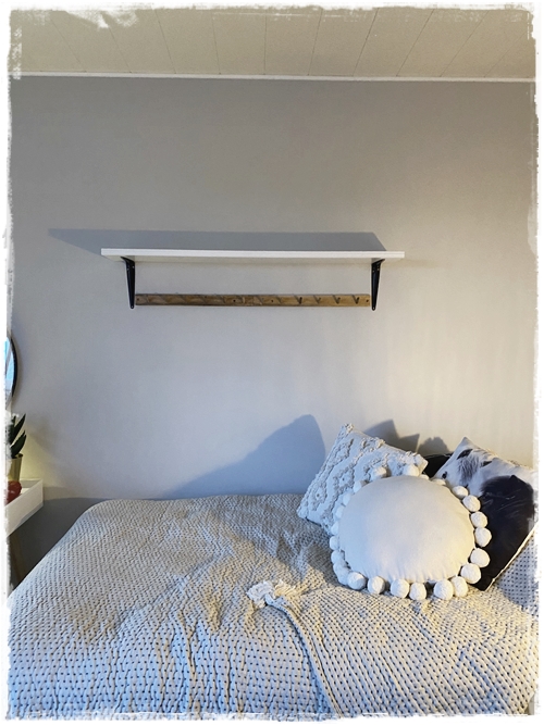 …ég var alveg ákveðin í að finna fallega hillu þarna fyrir ofan rúmið með snögum, og varð hún til úr hilluberum frá Bauhaus, hillu úr Ikea og snagabrettum úr H&M Home…