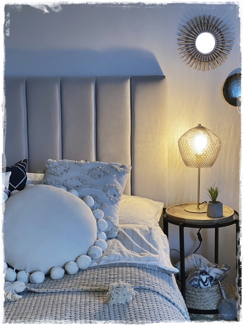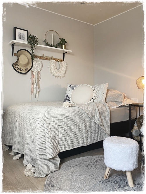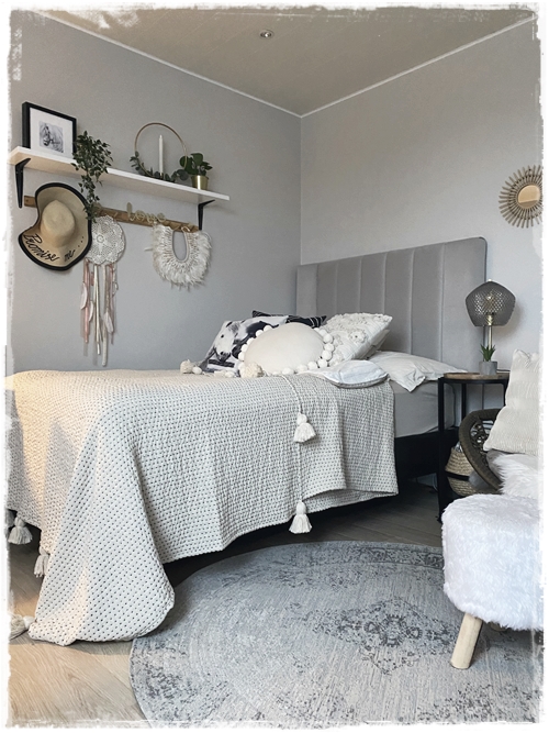 …svo var spurning um hvernig herbergið ætti að vera, og eins og áður sagði – þá langaði hana í svona bóhó stíl, sem þýðir auðvitað mikið af náttúrutónum, plöntur, bast, viður og bara almenn kózýheit…