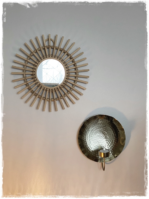 …svo var það spegillinn. Áður var hvítur spegill á bakvið hurðina hennar, en núna vildum við fá viðarspegil inn, svona fyrir bóhó-fílinginn – og þessi hérna frá Rúmfó* er æðislegur í það. Hann er með svona stöng aftan á þar sem hægt er að setja snaga eða bara hengja teppi á…