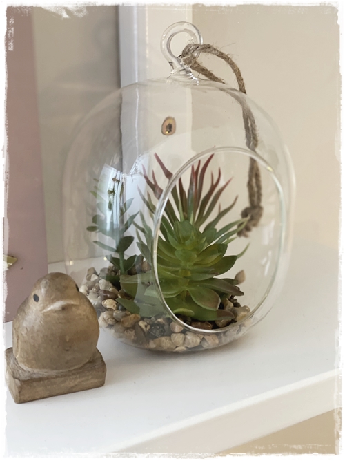 …hillan er svo bara skreytt með blómum og öðru slíku í bland. Hengiblómið efra er frá Rúmfó* og líka gullboxið og glerið með blóminu innan í. Neðra hengiblómið er frá Ikea…