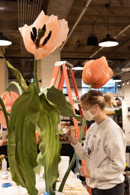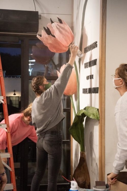 Alls hanga 250-300 túlípanar upp úr loftinu og hver hluti ferlisins var gerður að fullu með höndunum. Eins og alltaf erum við undrandi á því hvað sjónrænt teymi okkar getur gert! “