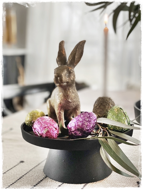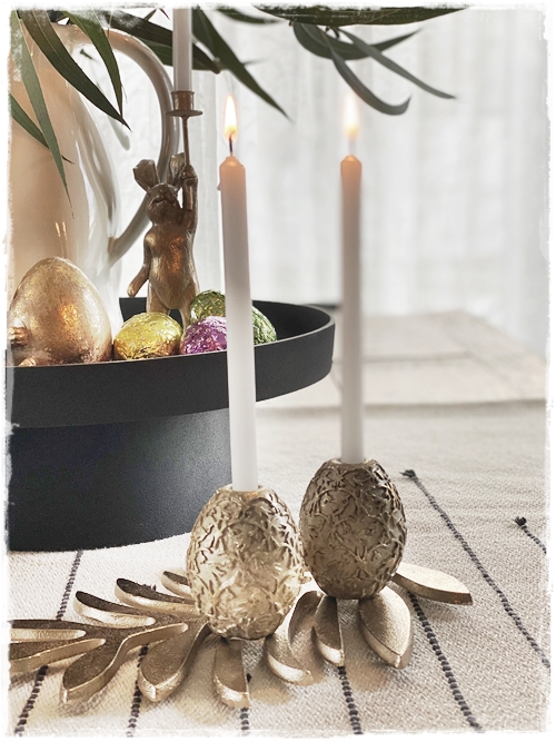…mig langaði að nota gyllta skrautið með Broste kökudiskunum frá Húsgagnahöllinni (eru ekki til núna nema í ljósu, en væntanlegir aftur). Þannig að ég er með könnu (líka frá HH) sem eru með Eucalyptusgreinum, svo eru bara stytturnar og súkkulaðiegg til skrauts. Ótrúlega einfalt…