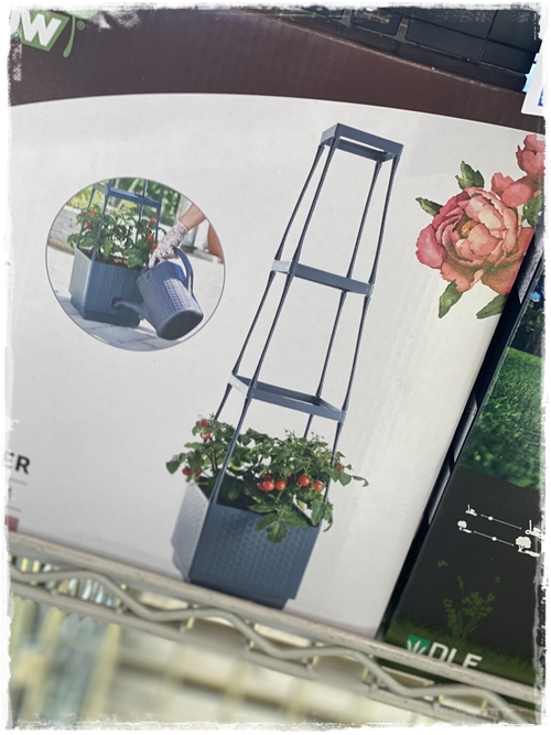 …og ég veit að það voru margir að dáðst að blómakassanum á pallinum hjá okkur – en það var einmitt svona kassi og svo skelltum við bara skrautgrind aftan við…