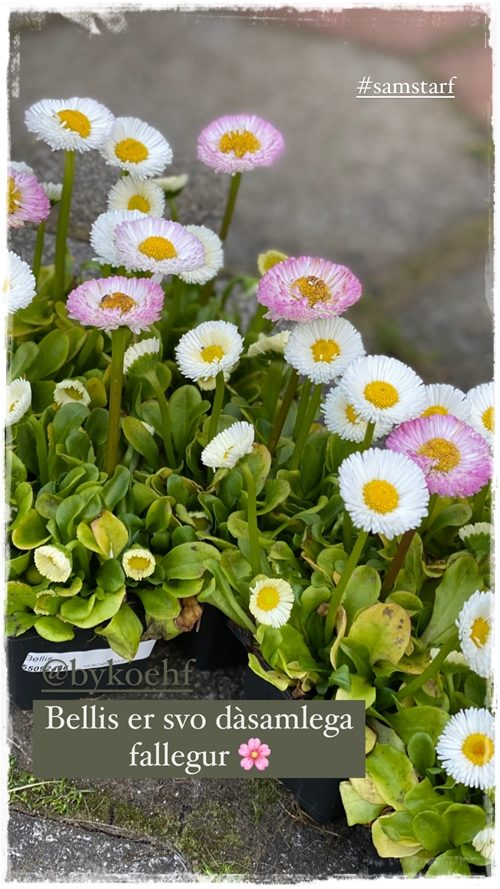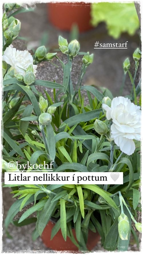 …ég held að ég hafi aldrei verið jafn sein að setja sumarblómin í pottana, og það sem meira er – ég er ekki enn búin að sækja pullurnar í útisófasettið fyrir sumarið. Þetta er að verða ansi hvimleitt að bíða og bíða, en það lætur vonandi sjá sig að lokum.