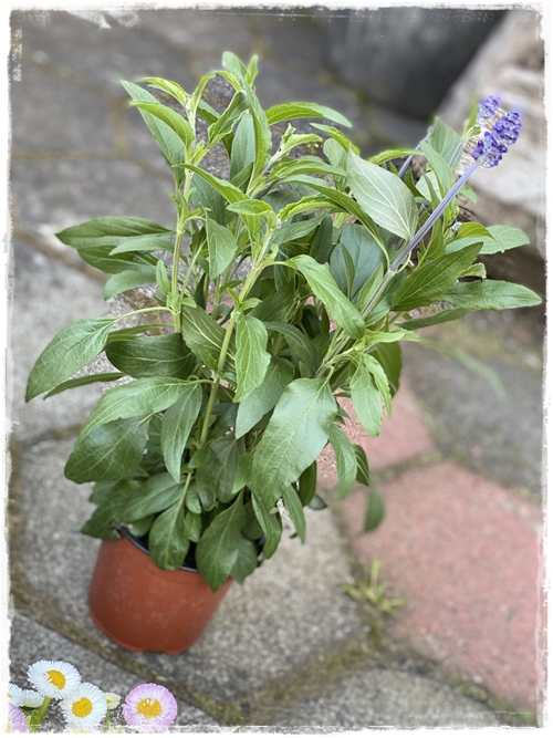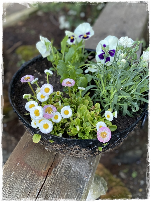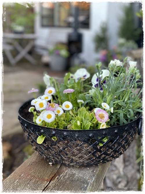 …þessi skál er búin að standa úti í nokkur ár, og ég fékk hana á nytjamarkaði, og ég bara spreyja hana reglulega. Í hana eru komar nokkrar stjúpur og bellis, ásamt nellikkum…