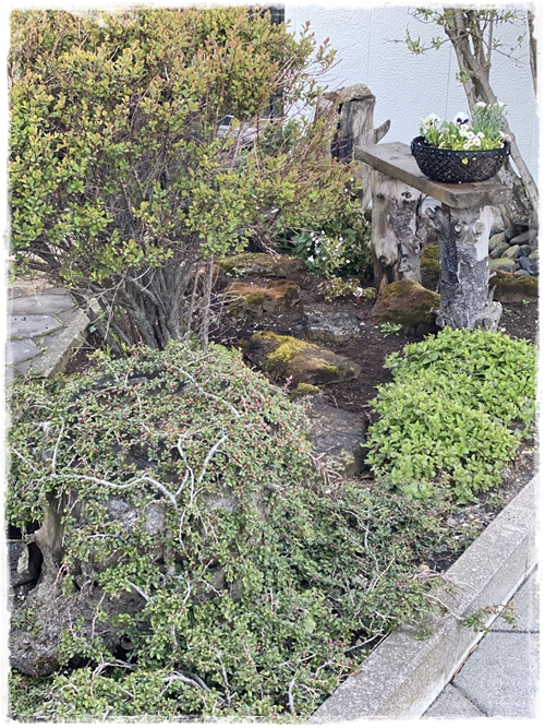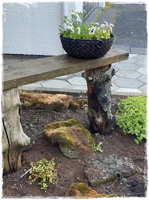 …í beðinu fyrir utan hús þá erum við með stóran trjátrumb sem við settum niður, svo setti ég tvo skriðmispla niður og þeir eru núna að þekja fallega beðið og búnir að skríða yfir trumbinn. Ég ákvað því að fá mér einn til viðbótar sem ég setti við bekkinn í beðinu og hlakka mikið til þess að sjá hann skríða af stað og dreifa úr sér…