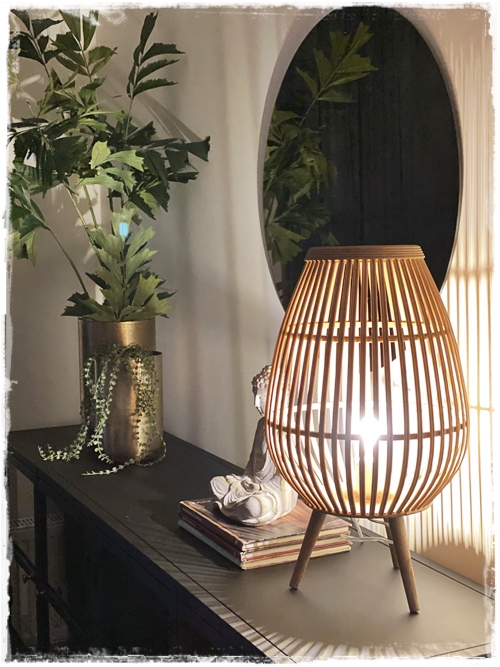 …þessi skógrind er úr bambus en ég er að sjá hana fyrir mér í stofunni fyrir pottablóm. Það væri hægt að bæta gler eða spegli ofan á og þá væri þetta ferlega smart að sjá: