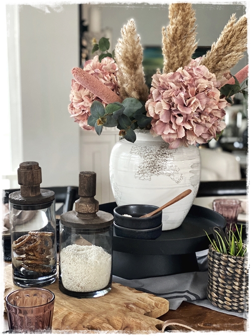 …þessi geggjuðu silki hortensíur fást í Höllinni, sem og öll stráin sem eru í vasanum, geggjaðir eilífaðar vendir…