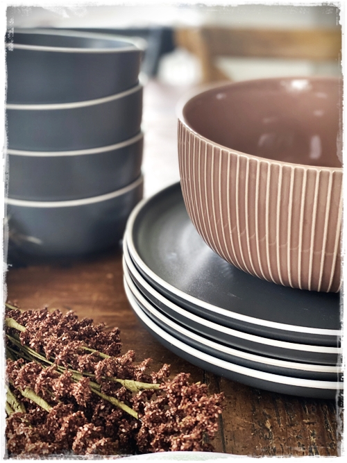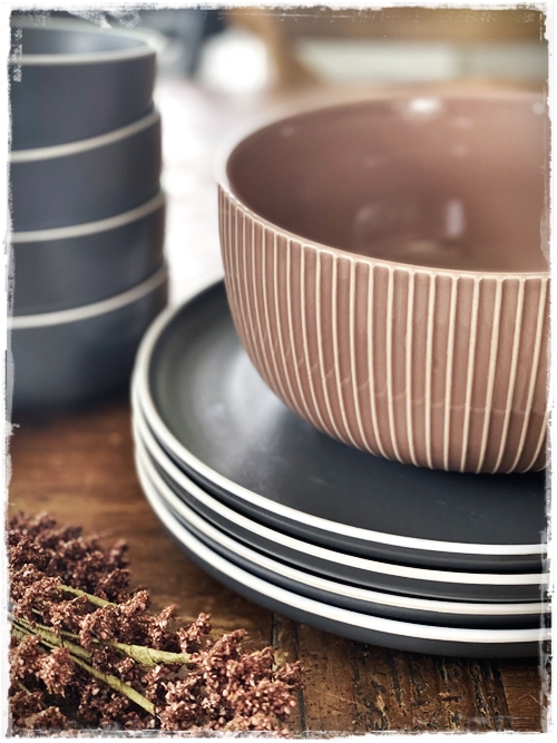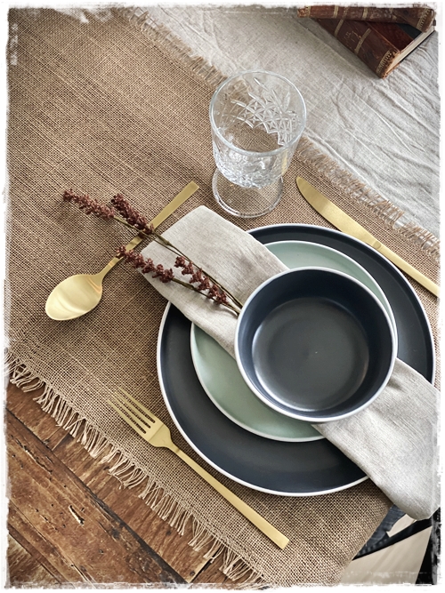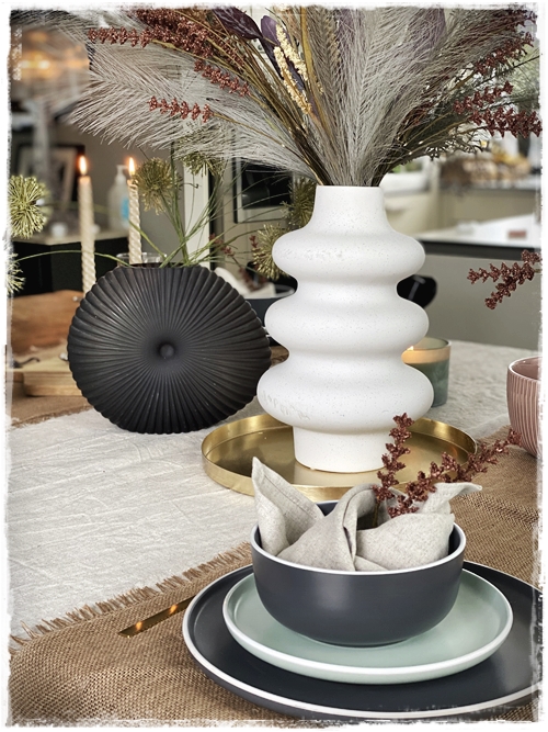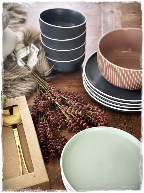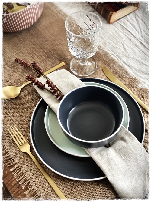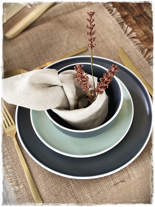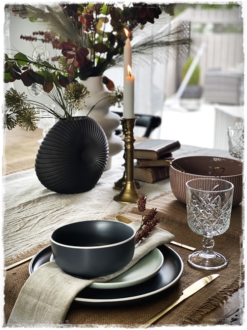 …mig langaði að leggja á borð með ykkur og nota til þess fallega stellið sem er til í gráu og grænu, og auðvitað tauservétturnar sem eru svo geggjaðar…