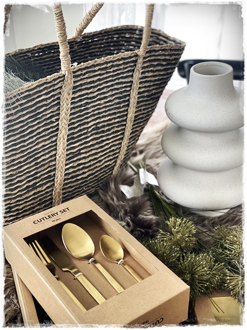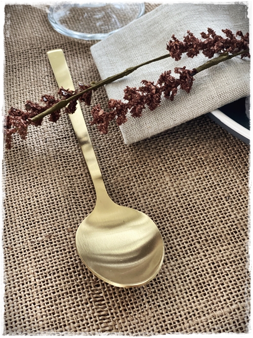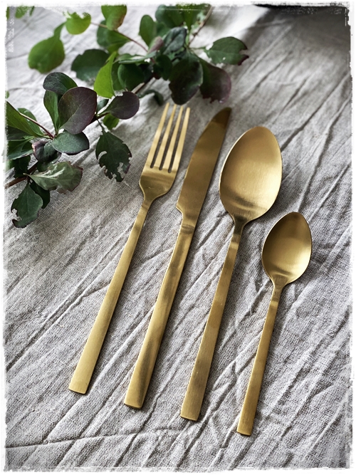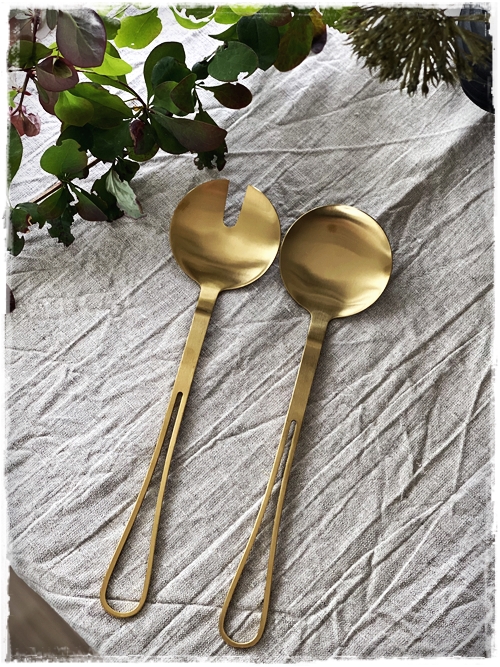 …svo eru þessi gylltu hnífapör ný, sérlega falleg áferð á þeim og falleg í laginu og sjáið bara þessar saladskeiðar…