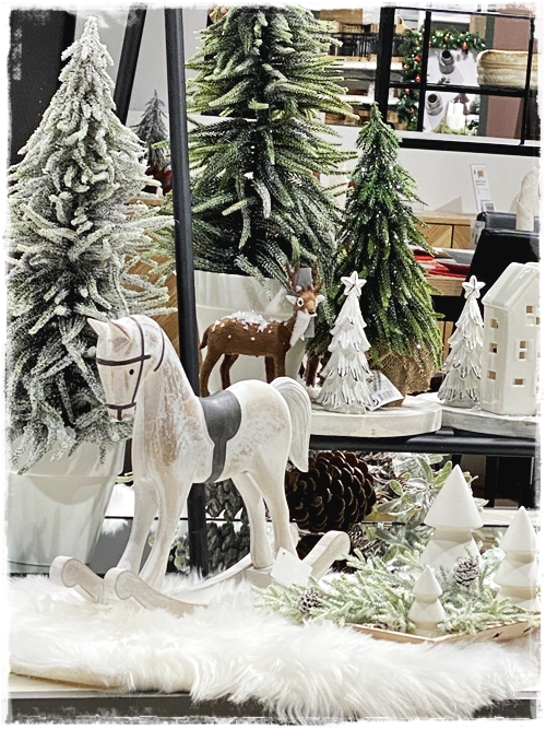 …hér sést samanblanda af því sem ég elska svona mikið um jólin, hvít kerti og nóg af jólatrjám…