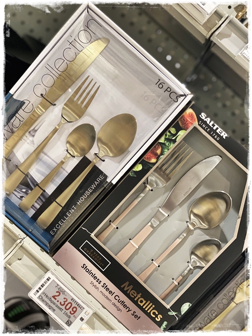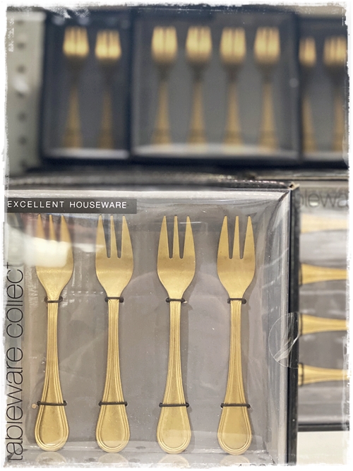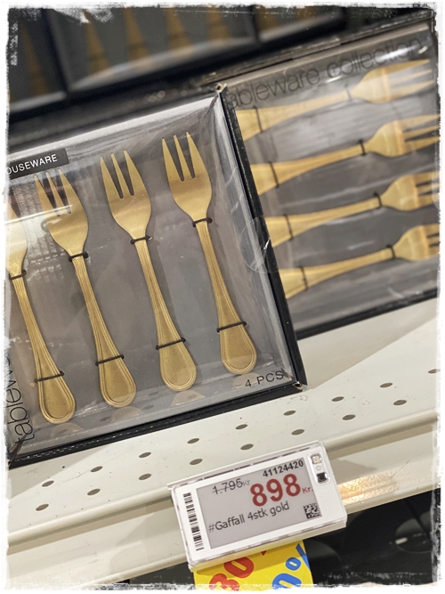 …það er eitthvað til af alls konar hnífapörum, en eins og alltaf þá var gullið að heilla mig. Fannst sérlega spennandi litlur kökugaflar sem eru saman í pakka, en ég keypti t.d. kökugafla fyrir skírnina hjá dóttur okkar, og þetta er eitthvað sem ég hef notað í ótal veislum síðan – mæli með svoleiðis innkaupum…