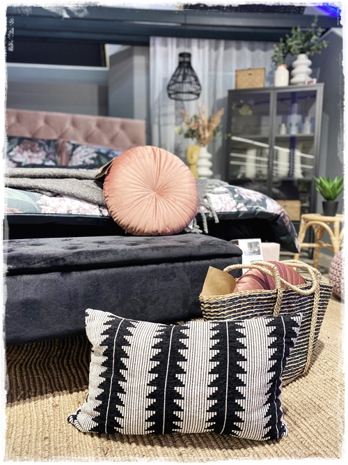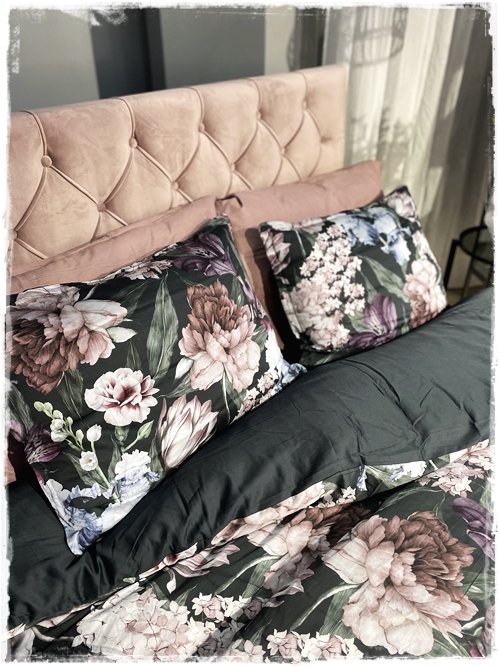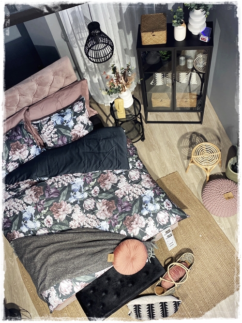 …svo finnst mér líka alltaf gaman að blanda smá mynstrum saman – eins og blómamynstrið í rúmfötunum og svo púðinn og taskann, sem eru geggjuð saman…