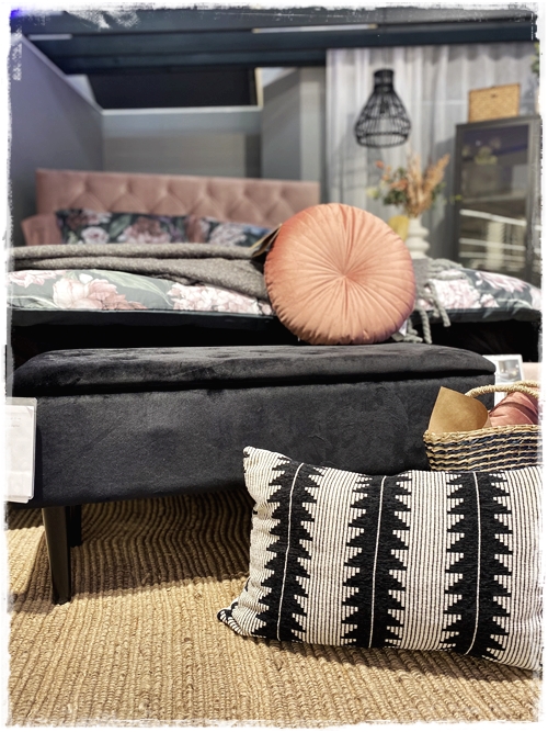 …þarna eru líka svona litlir blómastandar – sem geta verið snilldar náttborð ef það er ekki mikið pláss. Svo eru geggjaður velúrbekkur hérna við endann á rúminu, sem er með góðu geymsluplássi sem er frábært…