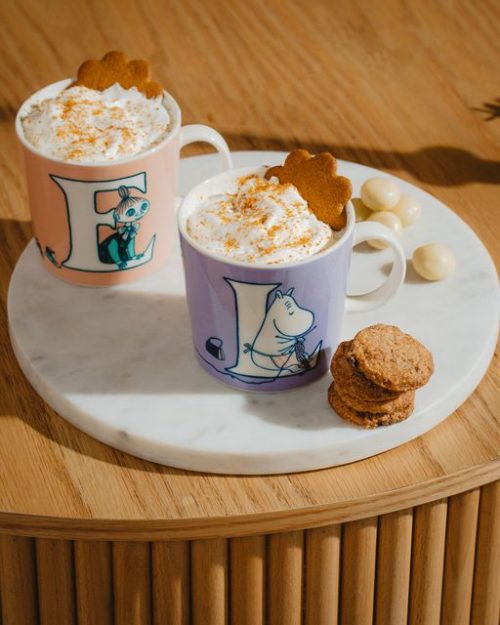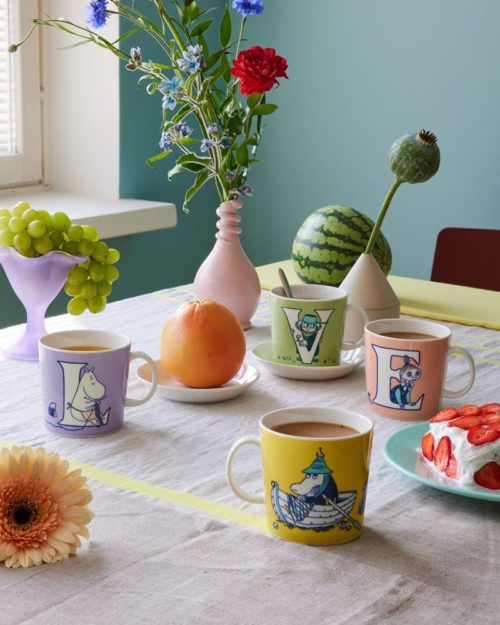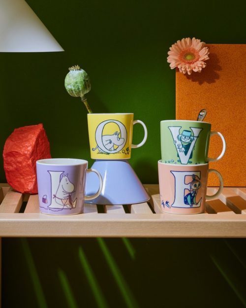 Nýju Moomin by Arabia pastellitu stafakrúsirnar eru skemmtilegar tækifærisgjafir. Bollarnir gefa dásamlegu stafaskreytingunum hennar Tove Jansson nýtt líf. Stafirnir eru byggðir á letri sem Tove handteiknaði fyrir bókina „Minningar Múmínpappa“ og kortin af Múmíndalnum. Persónuskreytingarnar hinum megin á krúsunum eiga einnig uppruna sinn í Múmínsögurnar sem við öll þekkjum. Á næstu árum er gert ráð fyrir að nýjir stafir bætist við.