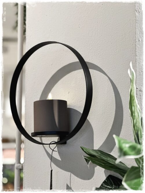 …og í stofunni hjá Telmu og Almari er líka gaman að sjá að það þarf ekki alltaf tvo stjaka saman, hér er einn við hliðina á kringlóttum spegli – þannig að þeir eru sérlega gott par saman…