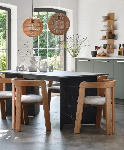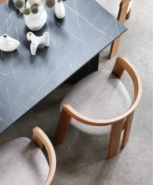 Svo fallegt borðstofuborð með svartri marmaraáferð, einstaklega fallegt með viðarstólum.