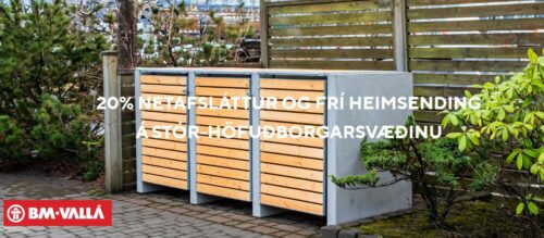 BM Vallá er að bjóða 20% afsláttur af flestum sorptunnuskýlum, hurðum, lokum og pumpum, þegar verslað er í gegnum vefverslun. Einnig bjóðum við upp á fría heimsendingu á stór-höfuðborgarsvæðinu (*101-116 Rvk, 170 Seltjarnarnes, 190 Vogar, 200-206 Kópavogur, 210-225 Garðabær, 220-221 Hafnarfjörður, 270 Mosfellsbær, 230-260 Keflavík, Njarðvík og nágrenni, 300 Akranes, 800 Selfoss og 810 Hveragerði).