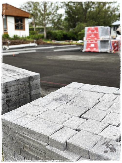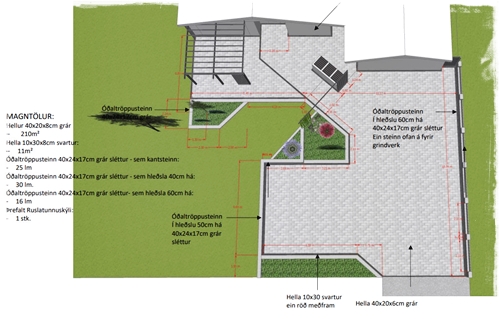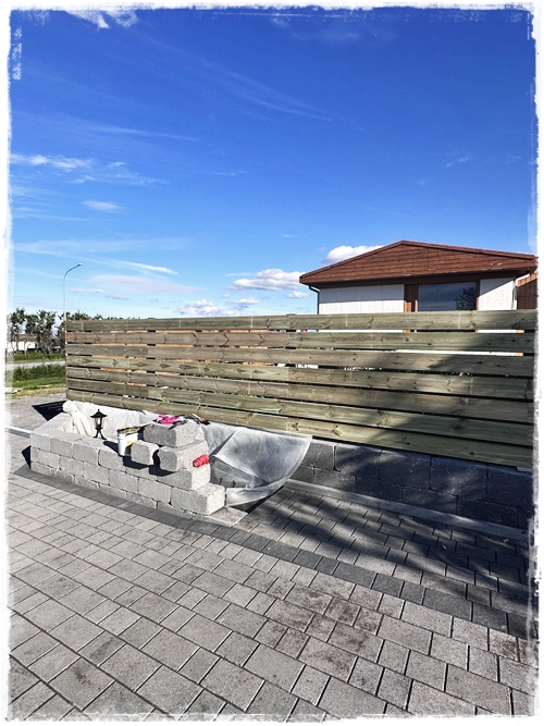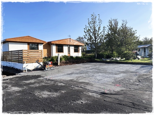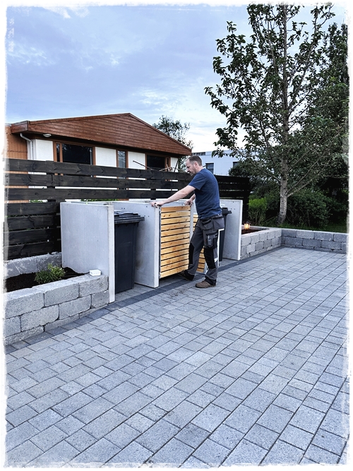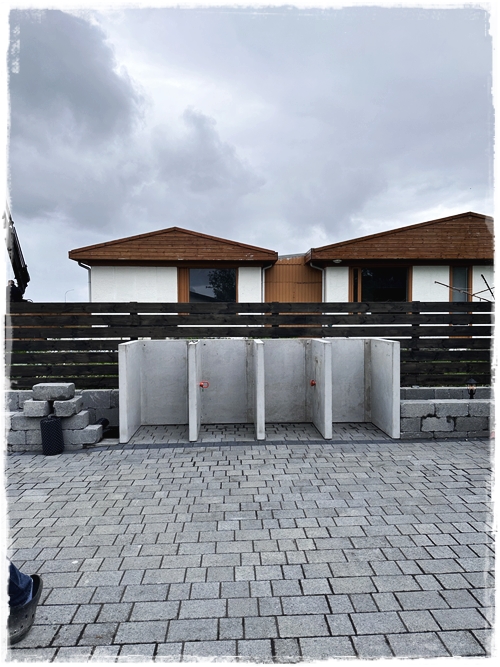 Eins og sést hér, þá voru settar hellur undir skýlið og beðið var ekki fullhlaðið fyrr en skýlið kæmi á sinn stað. Eins tók ég aðra skyndiákvörðun og ákvað að vera með pláss fyrir fjórar tunnur – bara svona til öryggis…
