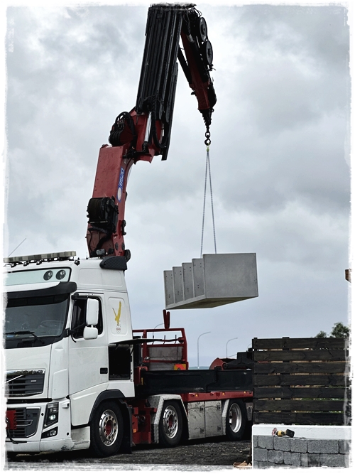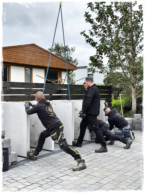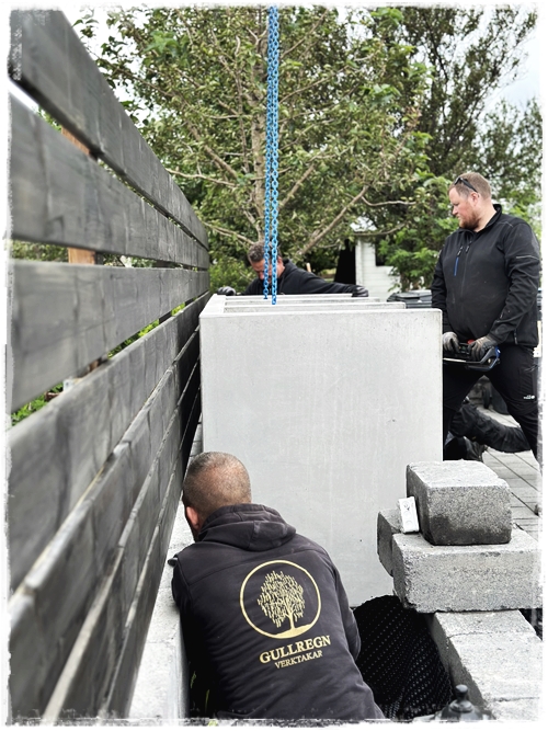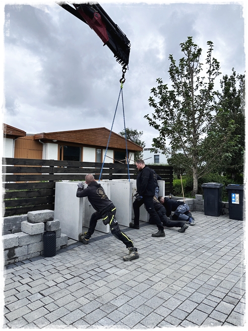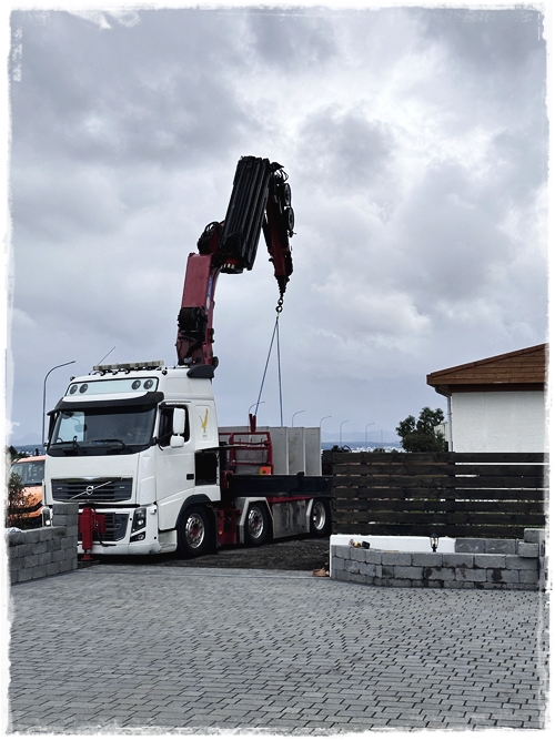…það var því mikil spenna og taugatitringur þegar að komið var með skýlið og að horfa á þetta fljúga yfir á sinn stað. Hraustir menn sem komu því á sinn stað, og svo snilld – að við gátum boltað vegginn aftan á skýlið sem gaf honum aukastyrk…