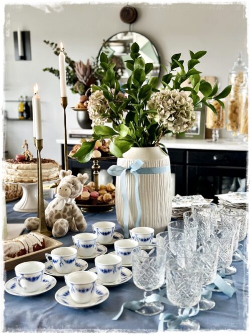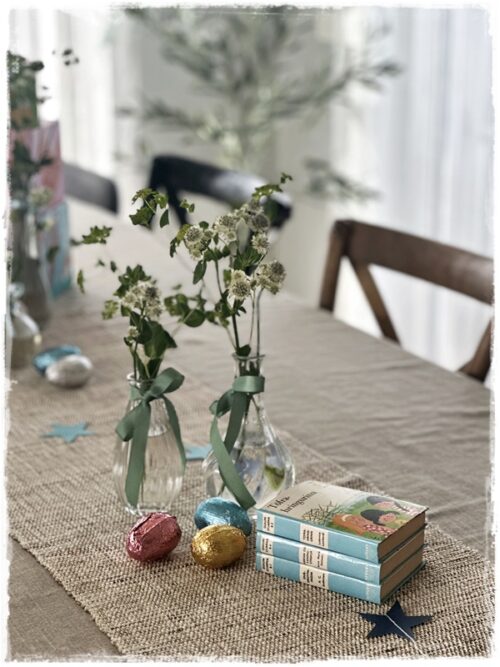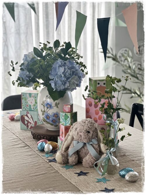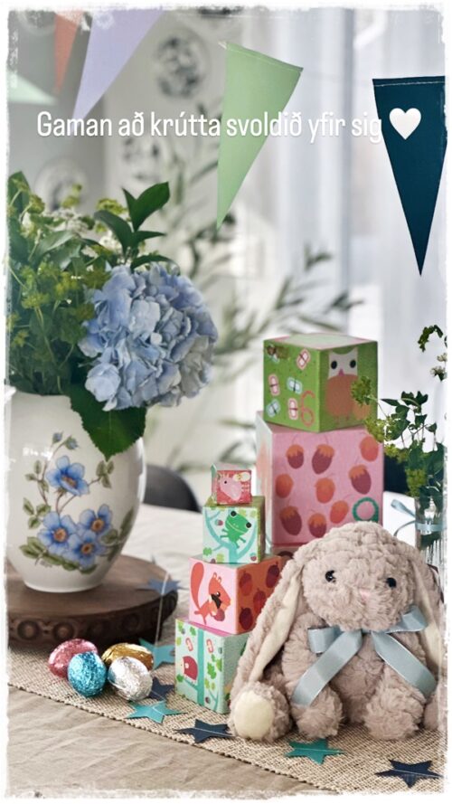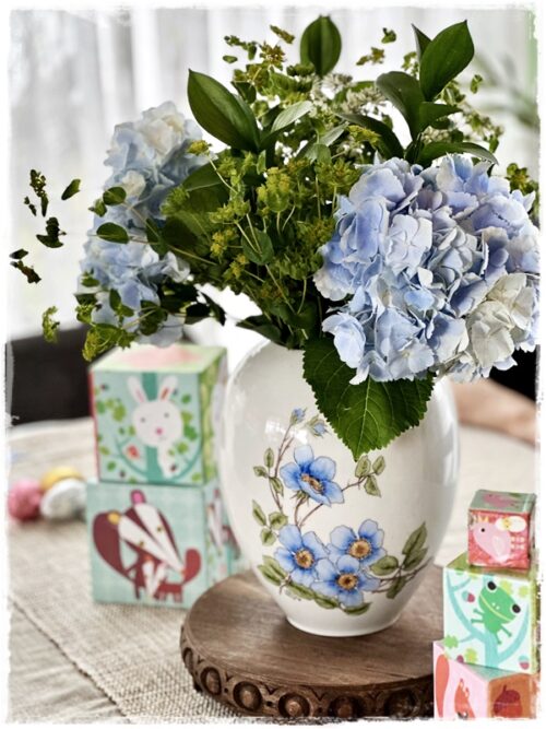 …þannig á borðið fór vasi sem mamma handmálaði og kubbarnir og bækurnar eru gömul leikföng úr fjölskyldunni. Hortensíurnar ljósbláu eru svo fallegar og ég keypti þær í Samasem…