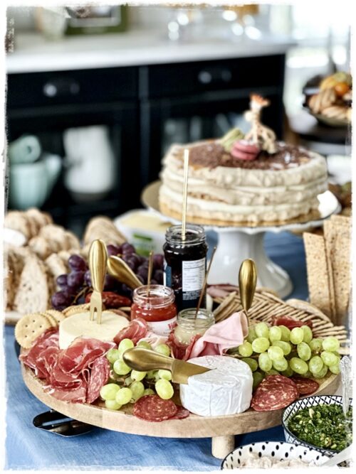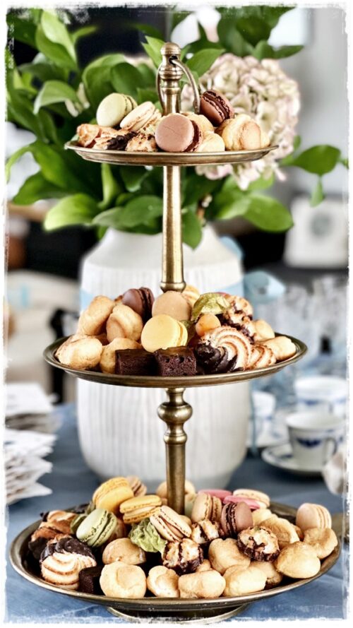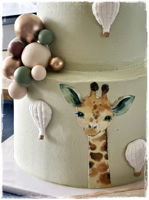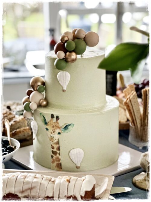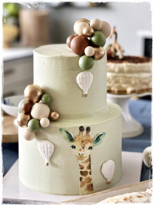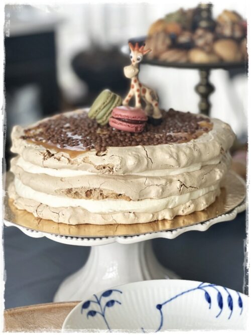 …ég skellti tveimur makkarónum ofan á marengstertuna til þess að gera hana meira í stíl, og skellti svo litlum gíraffa sem prýddi fyrstu afmælisköku sonarins fyrir 14 árum…